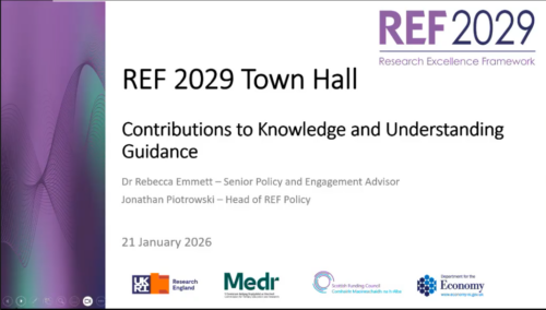 The latest REF townhall took place on the 22 January and focussed on the CKU (Contribution to Knowledge and Understanding). Key headline: CKU now carries 55%